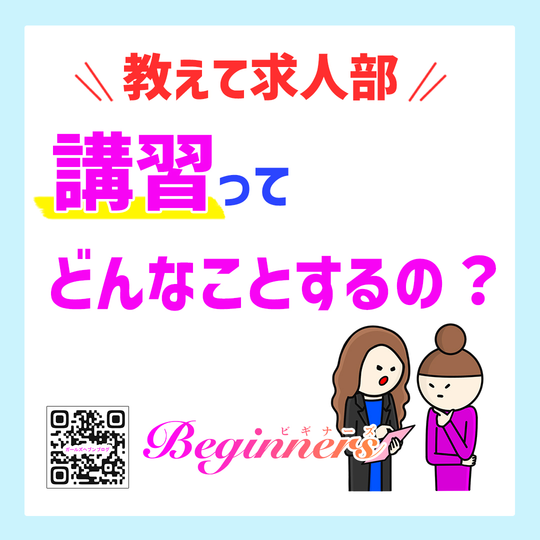 その女の子に合った講習内容 となっております★ お店の名前が 『ビギナーズ』って 名前なだけあって 技術云々よりも 頑張る気持ち の方が大事なんです なので基本的に講習は 入店してすぐではなく 入店してから お仕事やお店に慣れた 1か月後くらいに 受けてもらうのですが 実際にお仕事をしてみて 困った事や不安な事、 疑問に思ってる事などの カウンセリングから